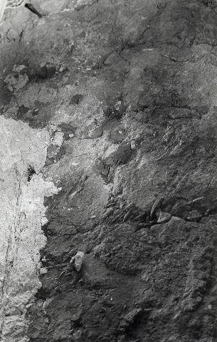 svartvitt fotografi föreställande mellanvägg i lerklining Kullagatan 39 kvarter Fiskaren. Från 1974.