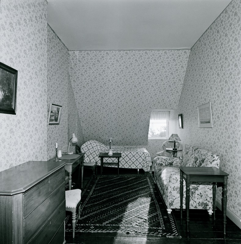 Bilden föreställer ett sovrum med snedtak och blommiga tapeter, ett litet fönster längst in. Längst in i rummet står också en säng med rutigt sängöverkast och framför det ett bord med en lampa på. Till vänster ytterligare ett bord med lampa och ljusstake på och på var sida stolar med klädd sits. Till höger i bild en soffa med blommig klädsel samt likadan fåtölj, vid sidan två bord det ena med lampa på. På golvet ligger en vävd matta. I förgrunden till vänster en byrå.