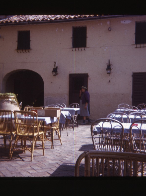 Bilder från Eva Holmberg Jacobssons liv och resor. I förgrunden bord och stolar på uteservering. I bakgrunden flervåningsbyggnad.
