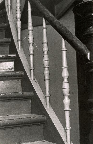 Bilden visar ett trappräcke med vackra trädekorationer i ljusare färg, på Södra Storgatan 11.