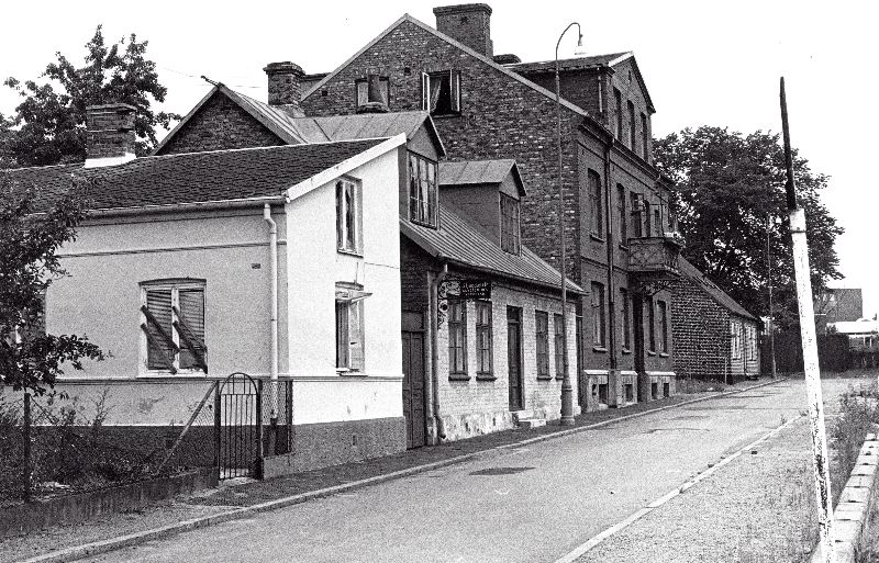 Fotografi som visar gatubild med smedjan "S. Ljunglbad & Co konstsmidesverkstad" och bredvidliggande byggnader.