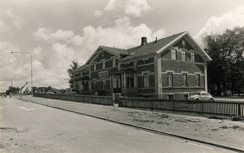 Skolhus med dubbla entréer mot gatan. Staket längs hela skolgården och bil (VW) parkerad vid skolhusets gavel.