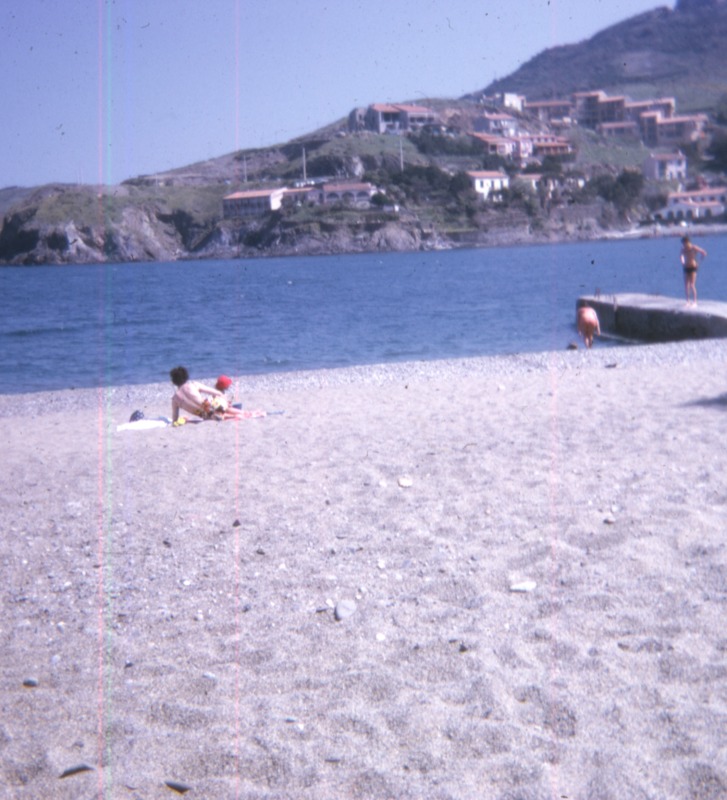 Bilder från Eva Holmberg Jacobssons liv och resor. I förgrunden strand med brygga och några solbadare. I bakgrunden berg med stadsbebyggelse.