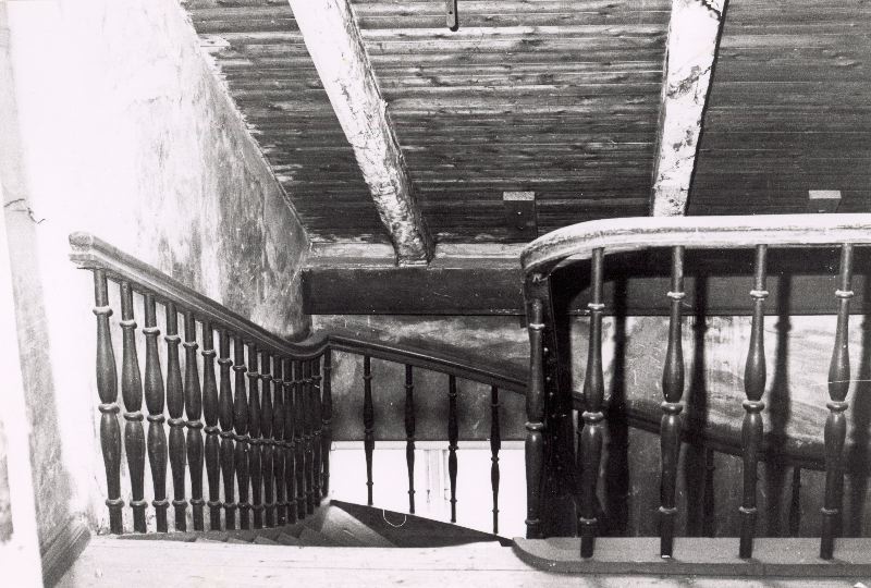 Bilden visar en vindstrappa av trä med enkel balustrad på Södra Storgatan 13. Bilden är tagen i nerifrån.