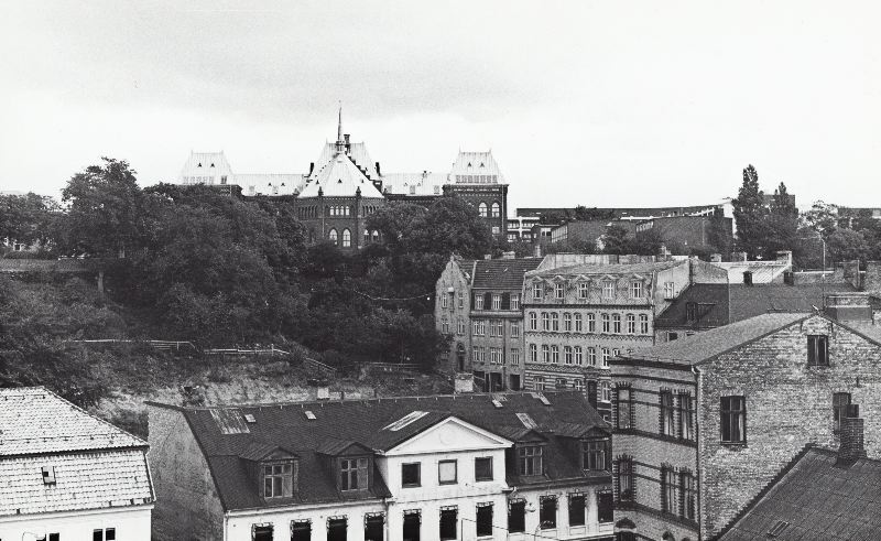 Utsikt från Mariakyrkan fotograferat från Mariakyrkans tak, bostadshus i centrum, i bakgrunden Rosenträdgården och Nicolaiskolan.