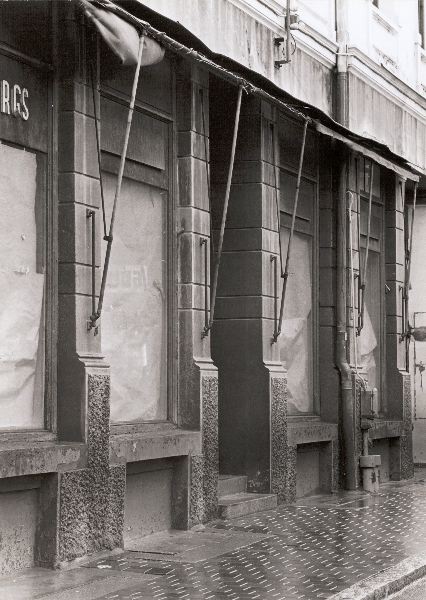 Detaljbild av gatuplanet. Markiser och skyltfönster.