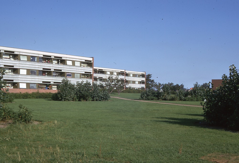 Bilder från stadsdelen Drottnoinghög. I förgrunden gräsmatta med grupper av buskar. I bakgrunden trevånhgshus, bostadshus.