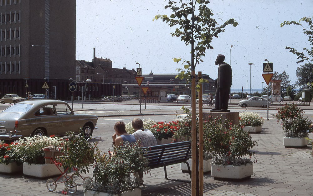 Bilder från stadsdelen Söder. Mäster Palms plats. Torg med blomarrangemang och staty Mäster Palm. I bakgrunden gatukorsning.
