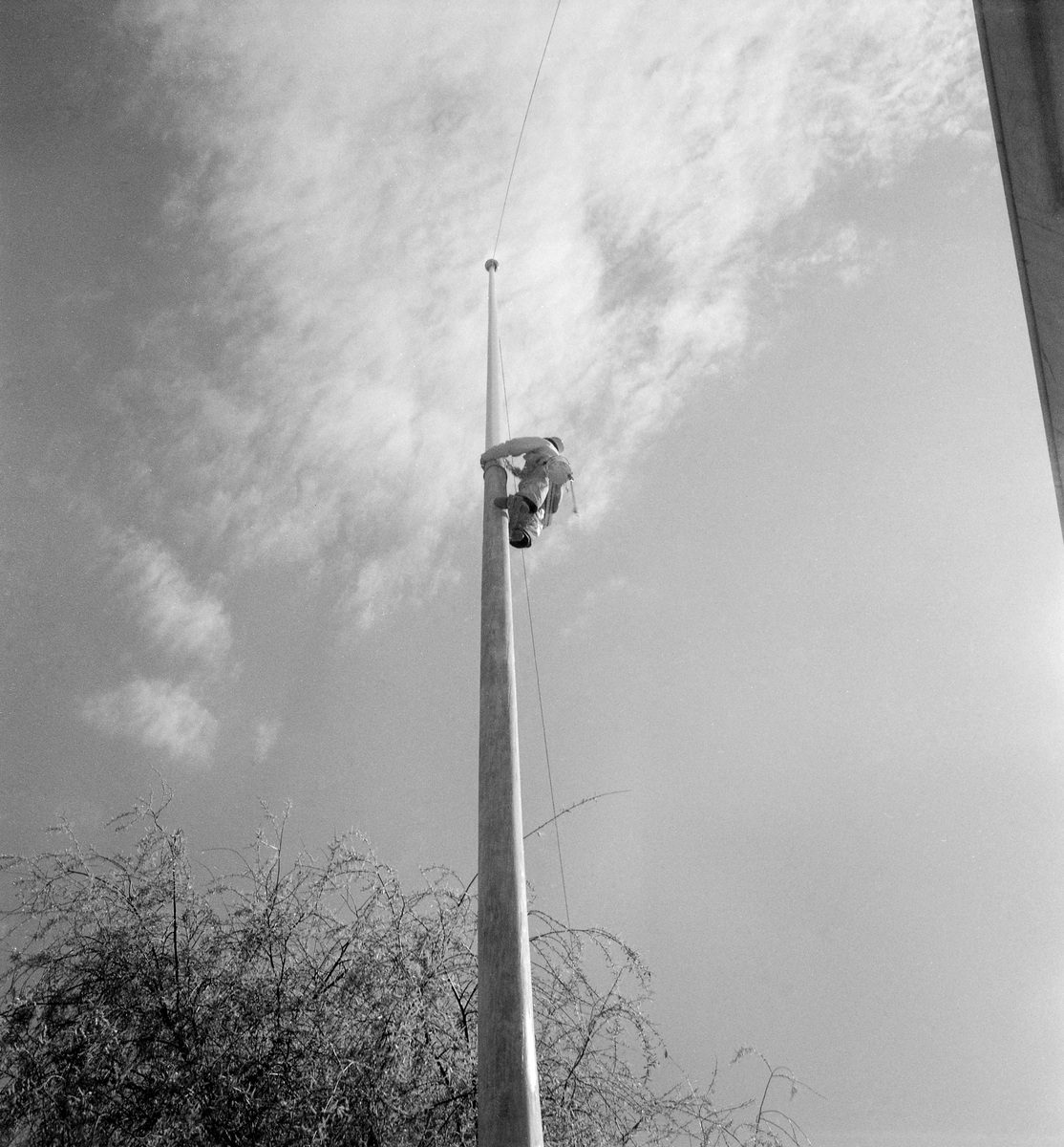 Fanns det inget bättre sätt? Det sägs att museets flaggstång var Linköpings högsta (24 meter) innan den kapades något. Om det är med sanningen överensstämmande har inte kontrollerats för denna uppgift. Oavsett krävde ommålningen av den resta stången goda nerver. Foto 1955.