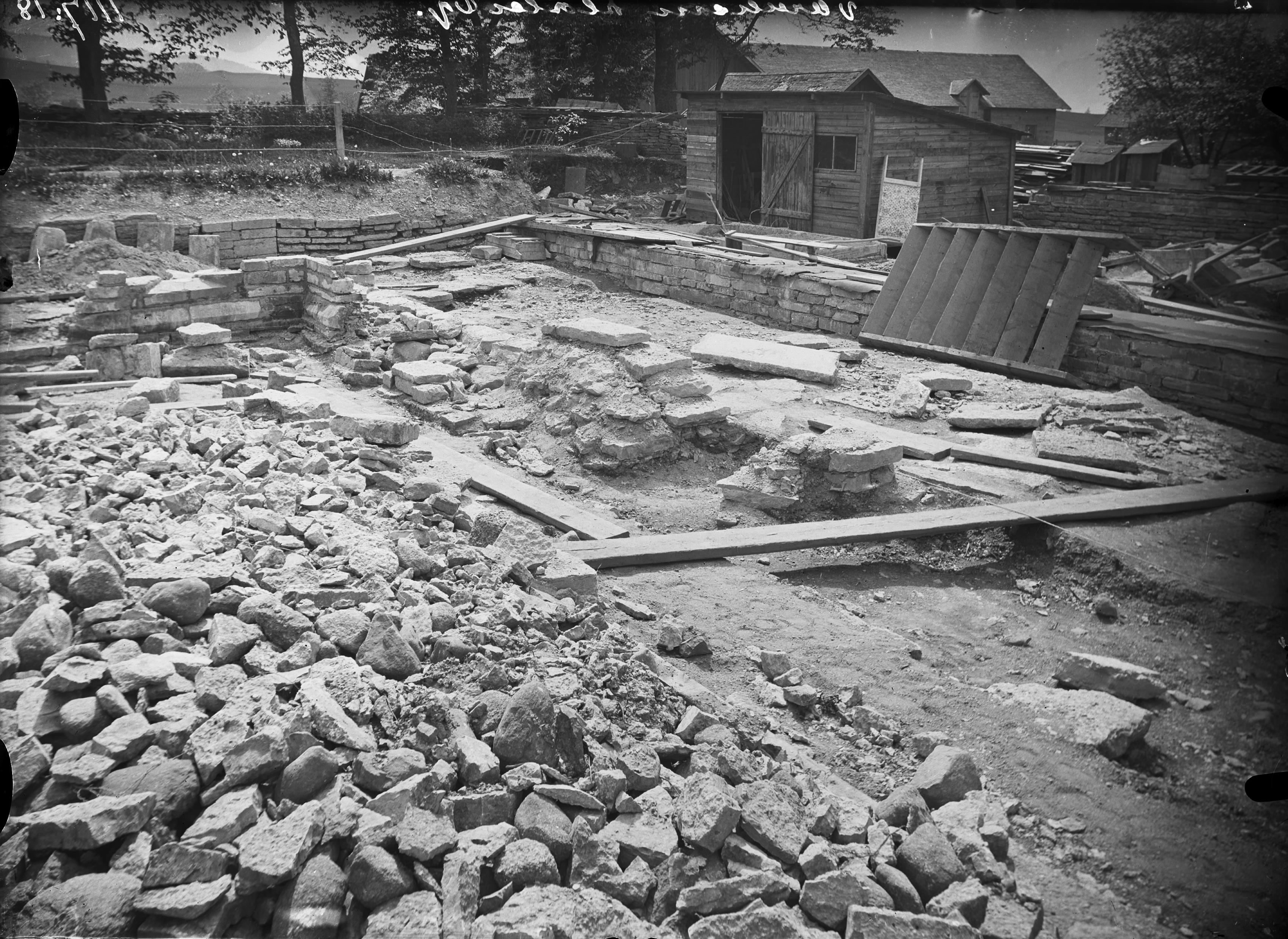 Korsgångens sydvästra hörn och västra längans östra mur. Innersidan av södra längans södra mur under utgrävning. Västra längans västra mur är här konserverad. Från nordöst.
