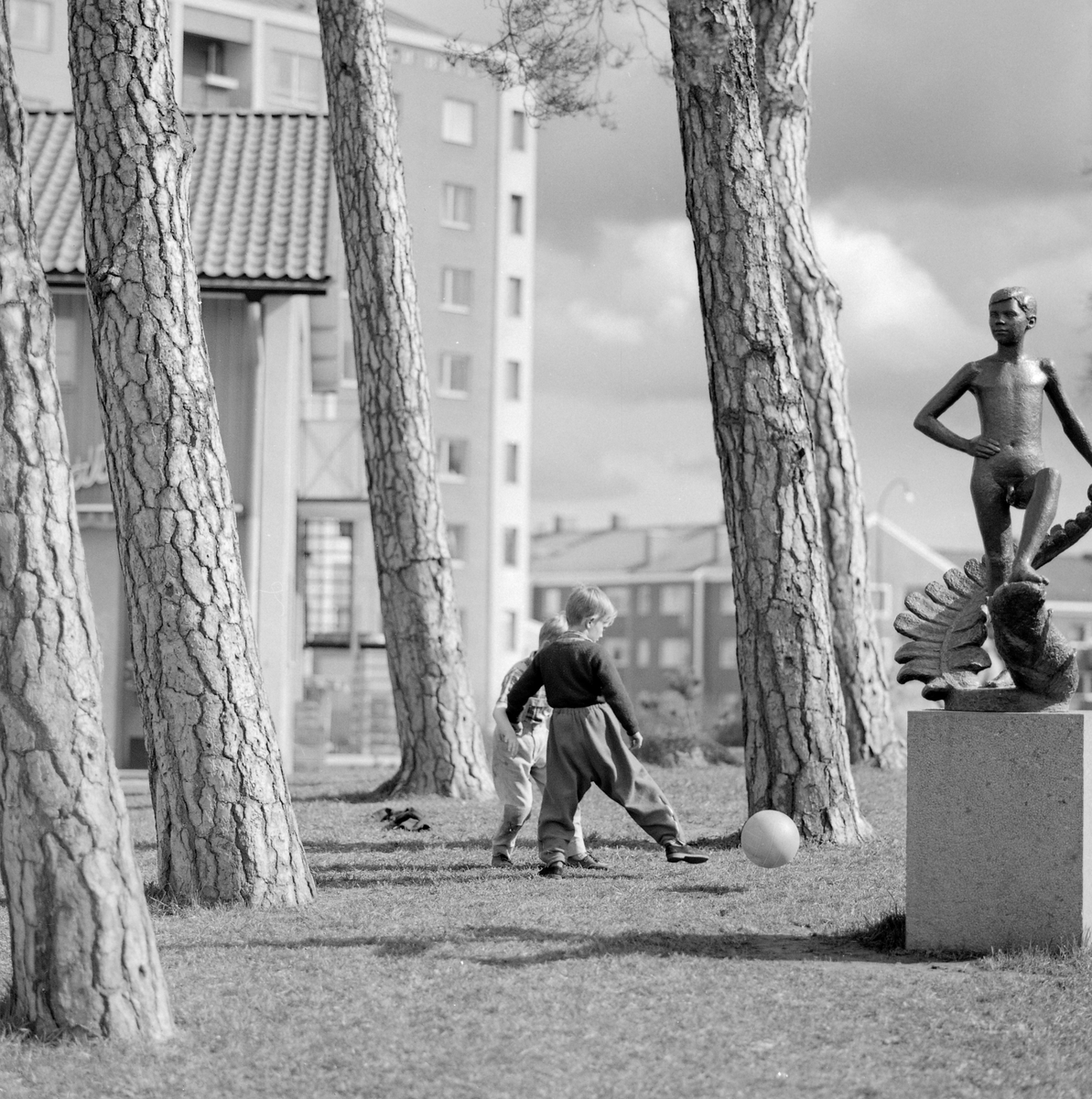 Lekande barn vid Lennart Källströms bronsskulptur "Pojke" i stadsdelen Majelden, Linköping.