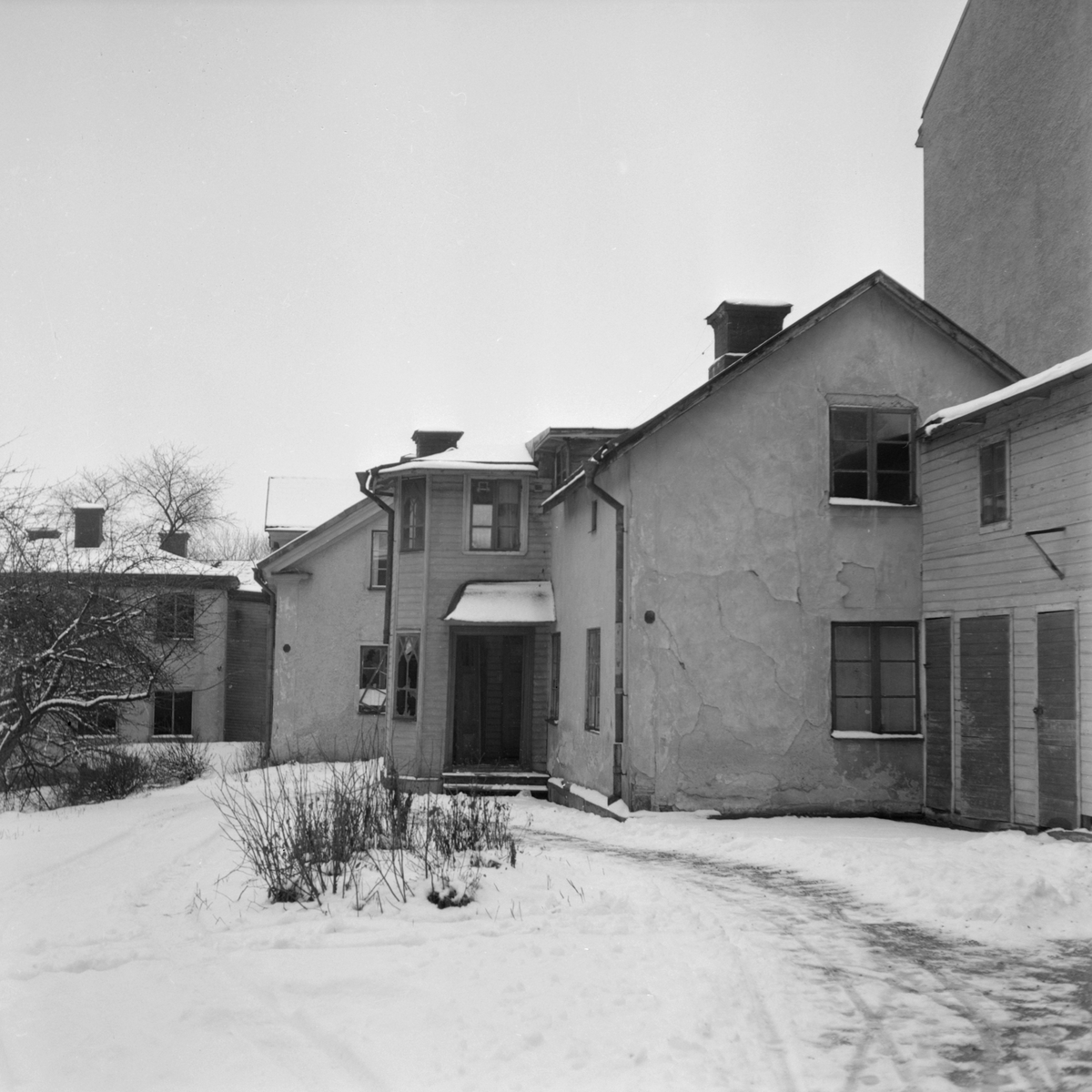 Gården till Gripgatan 1 i Linköping. Fotoåret 1965 stod ännu många av de ursprungliga miljöerna i området kvar men skulle närmast fullkomligt bortrivas för dagens bebyggelse.
