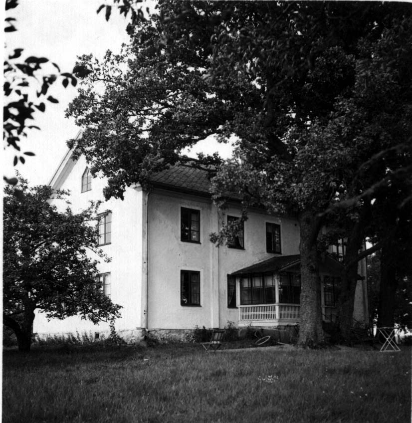 Ett ljust putsat tvåvåningshus med höga träd framför glasad veranda.