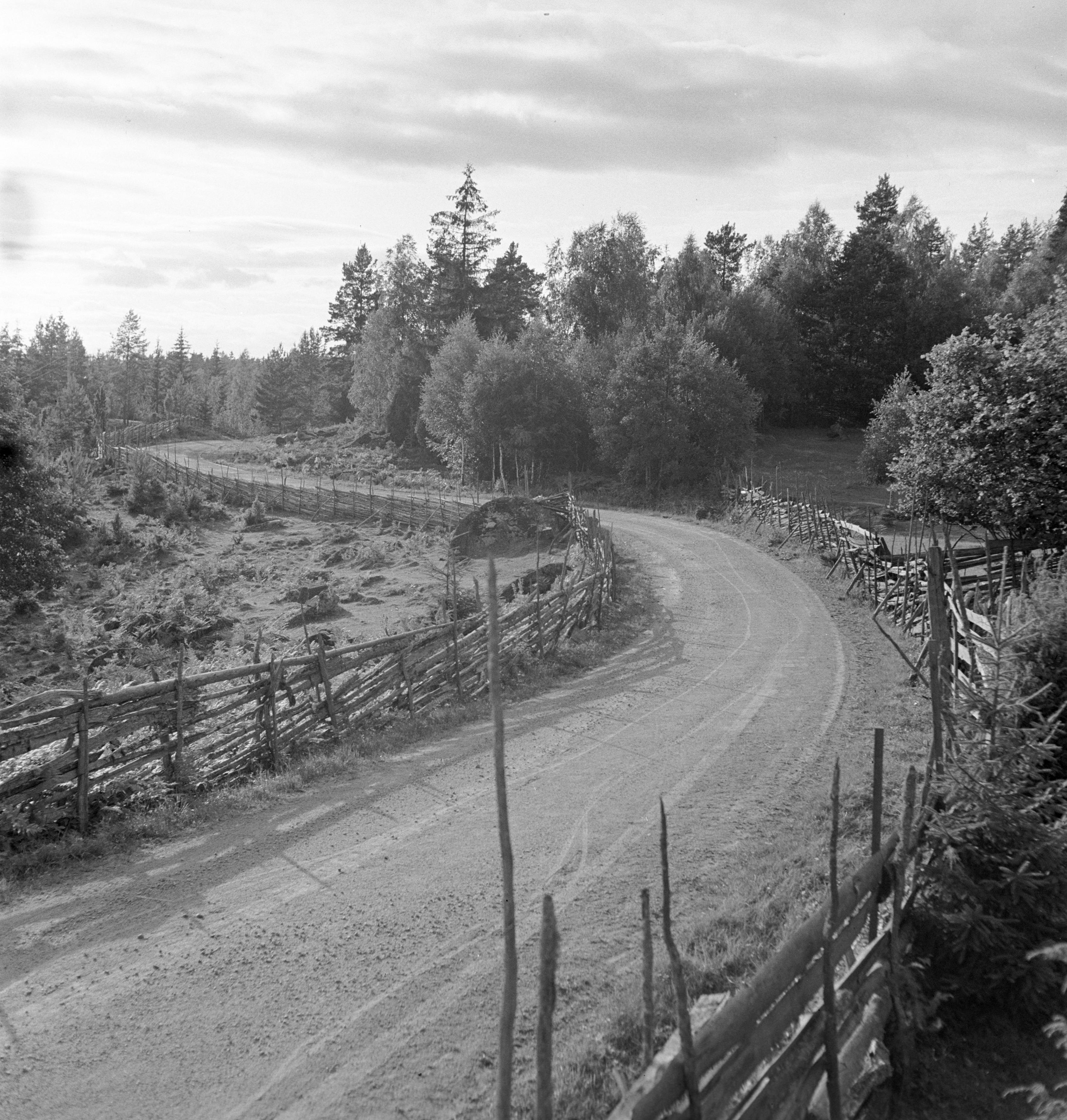 Gammal landsväg med gärdesgårdar. Bilden troligen från 1940-talets första hälft.
