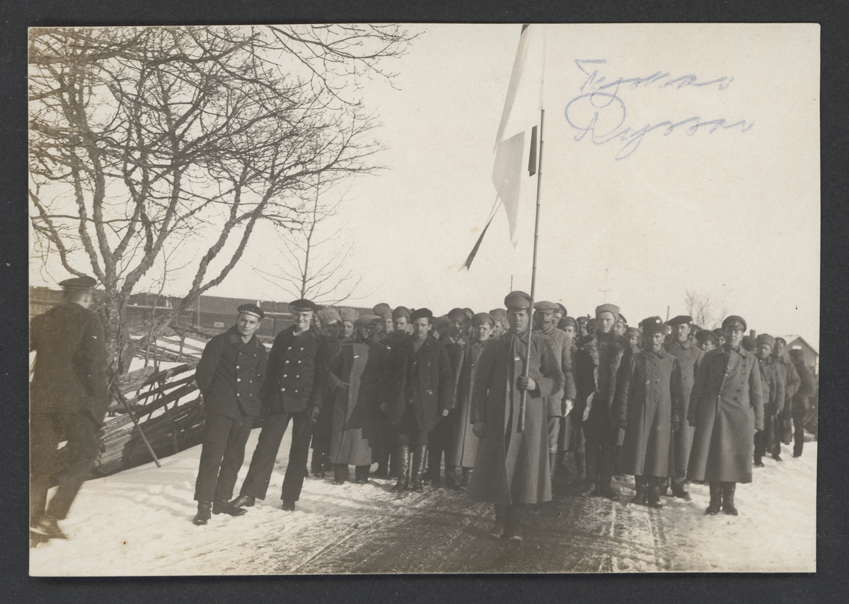 Bilden visar en grupp ryska krigsfångar i sällskap av några tyska sjömän från slagskeppet Westfalen.