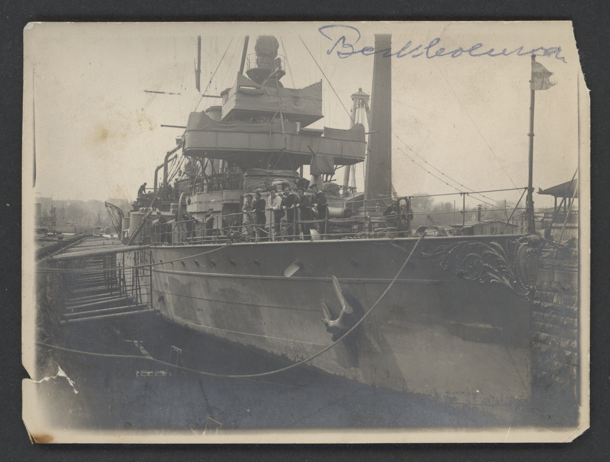 Bilden visar ett pansarskepp i torrdockan. Förmodligen är det Tapperheten eller Manligheten.