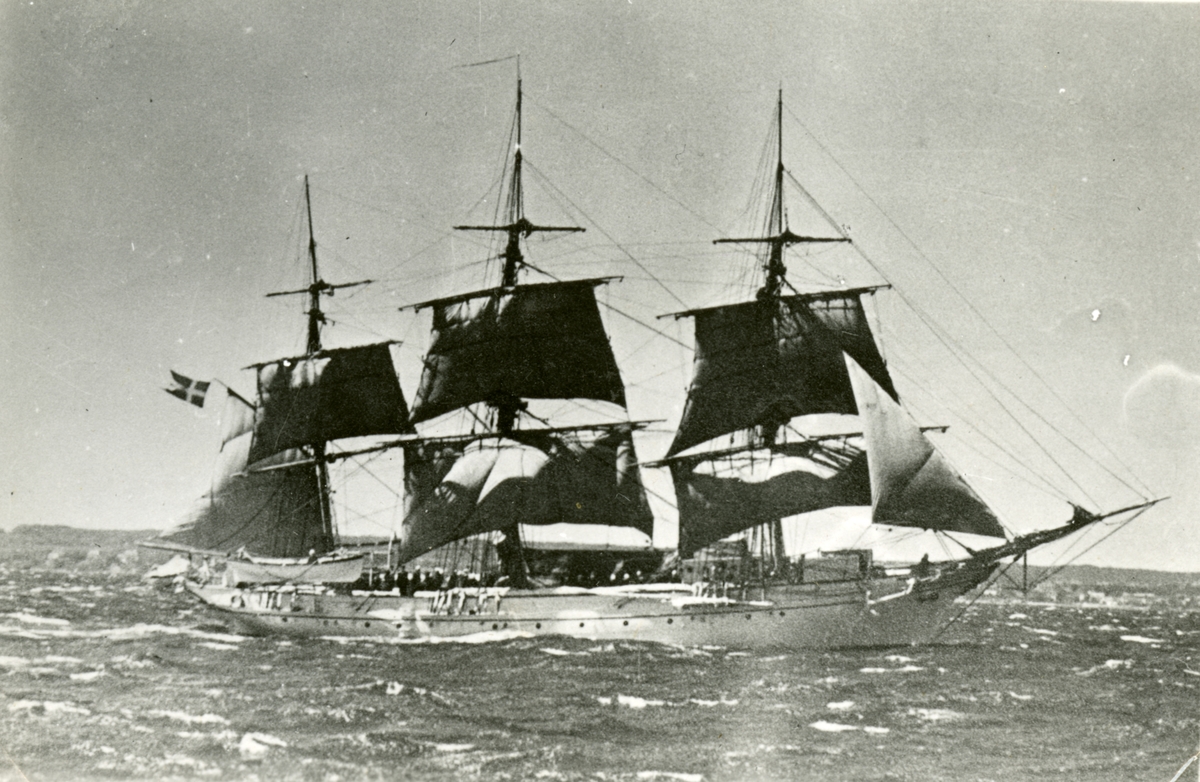 Bilden visar skeppsgossefartyget Jarramas med satta segel till sjöss från styrbordssida.