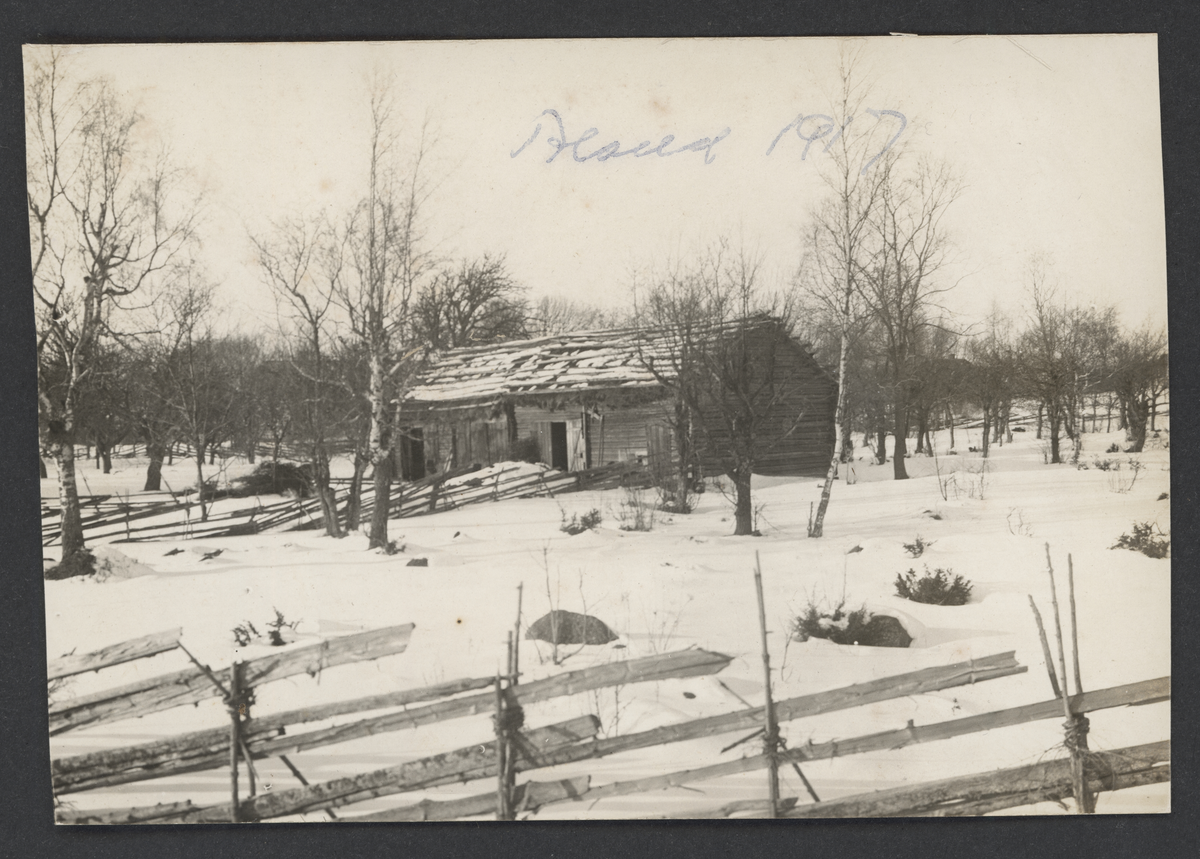 Bilden visar en enkel ladugårdsbyggnad med inhägnad i en snötäckt vinterlandskap på Åland.
