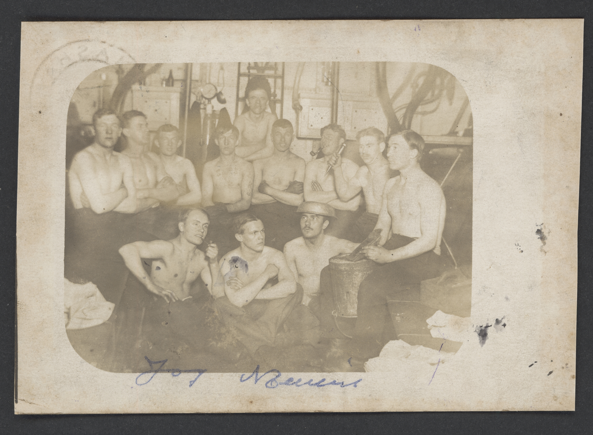 Bilden visar en grupp sjömän med bar överkropp som verka skämta. Några röker pipor, en man har en plåt skål på huvudet och blir attackerat av en annan med en stor järnspik.
