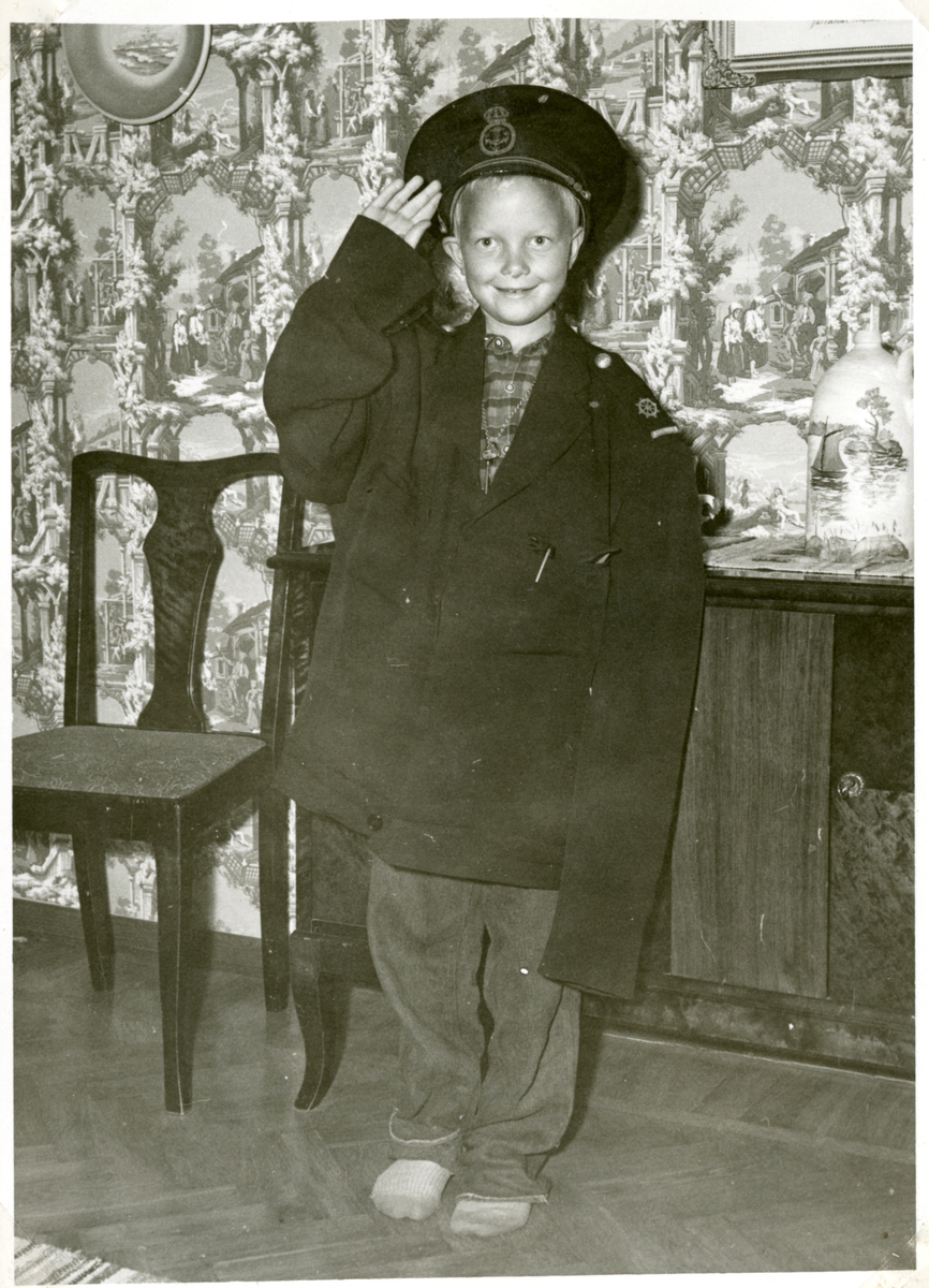En liten pojke, klädd i alldeles för stora uniformsjacka och mössa hälsar militäriskt.