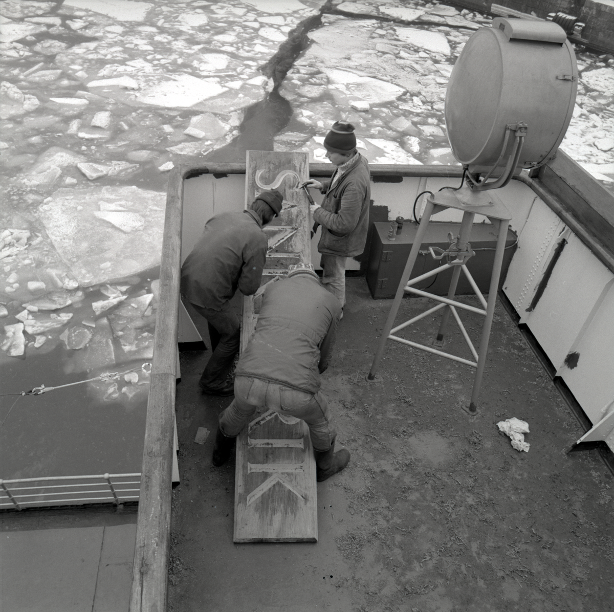 Isbrytaren SANKT ERIK. Arbete med namnskylten vid kaj i Stockholm.