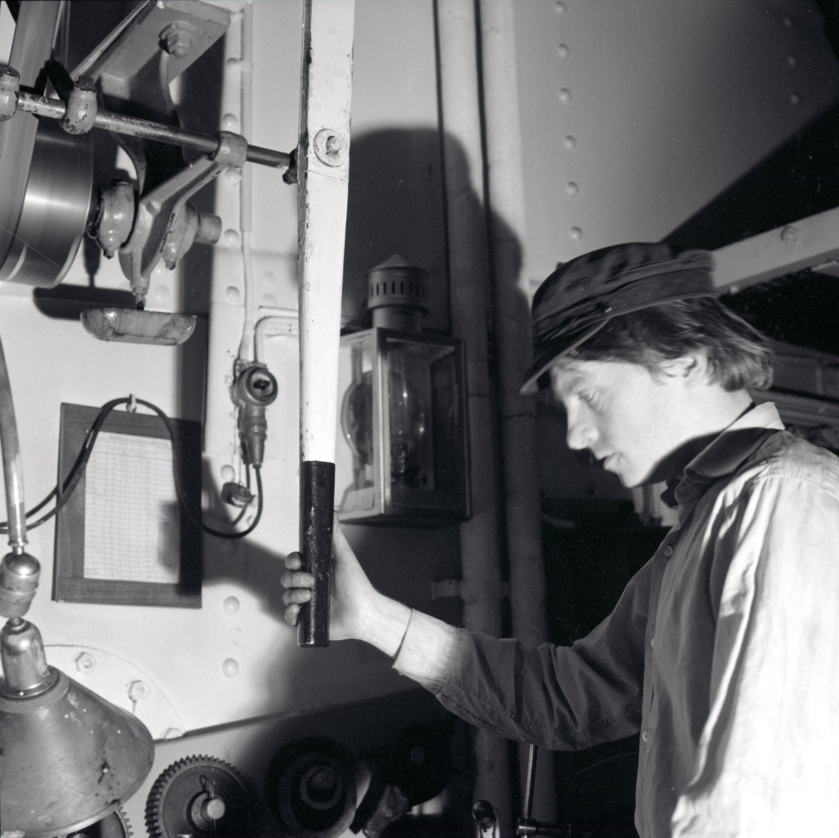 Isbrytaren SANKT ERIK. 1:e maskinist Bertil Sahlberg vid svarven i förliga maskinrummet.