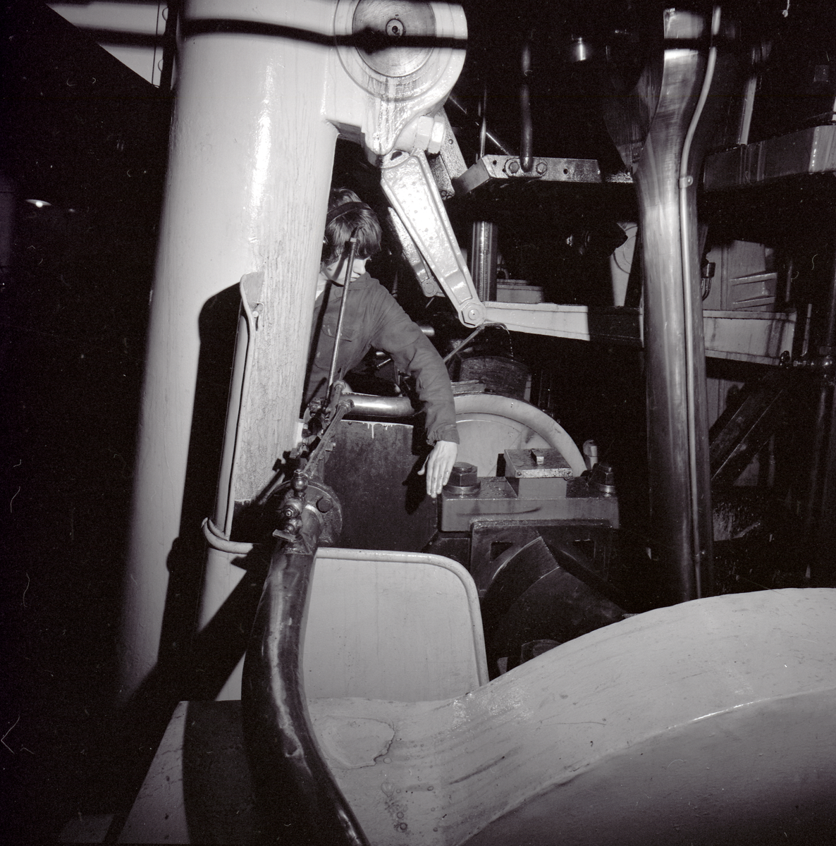Isbrytaren SANKT ERIK. Smörjare känner på vevlager i aktra maskin.