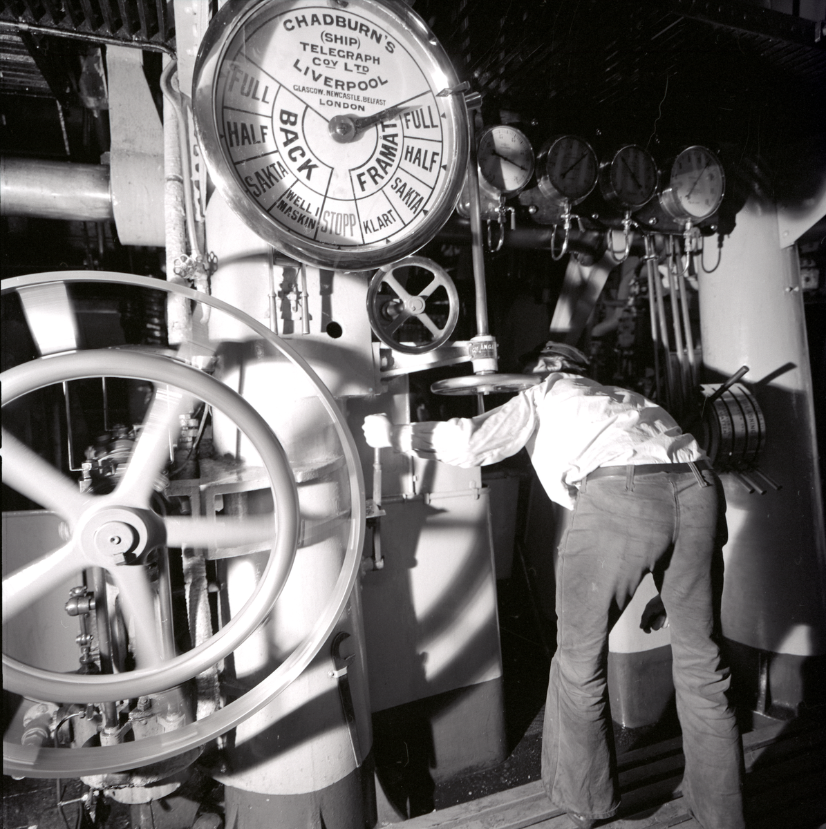 Isbrytaren SANKT ERIK. 1:e maskinist Bertil Sahlberg manövrerar aktra maskin.