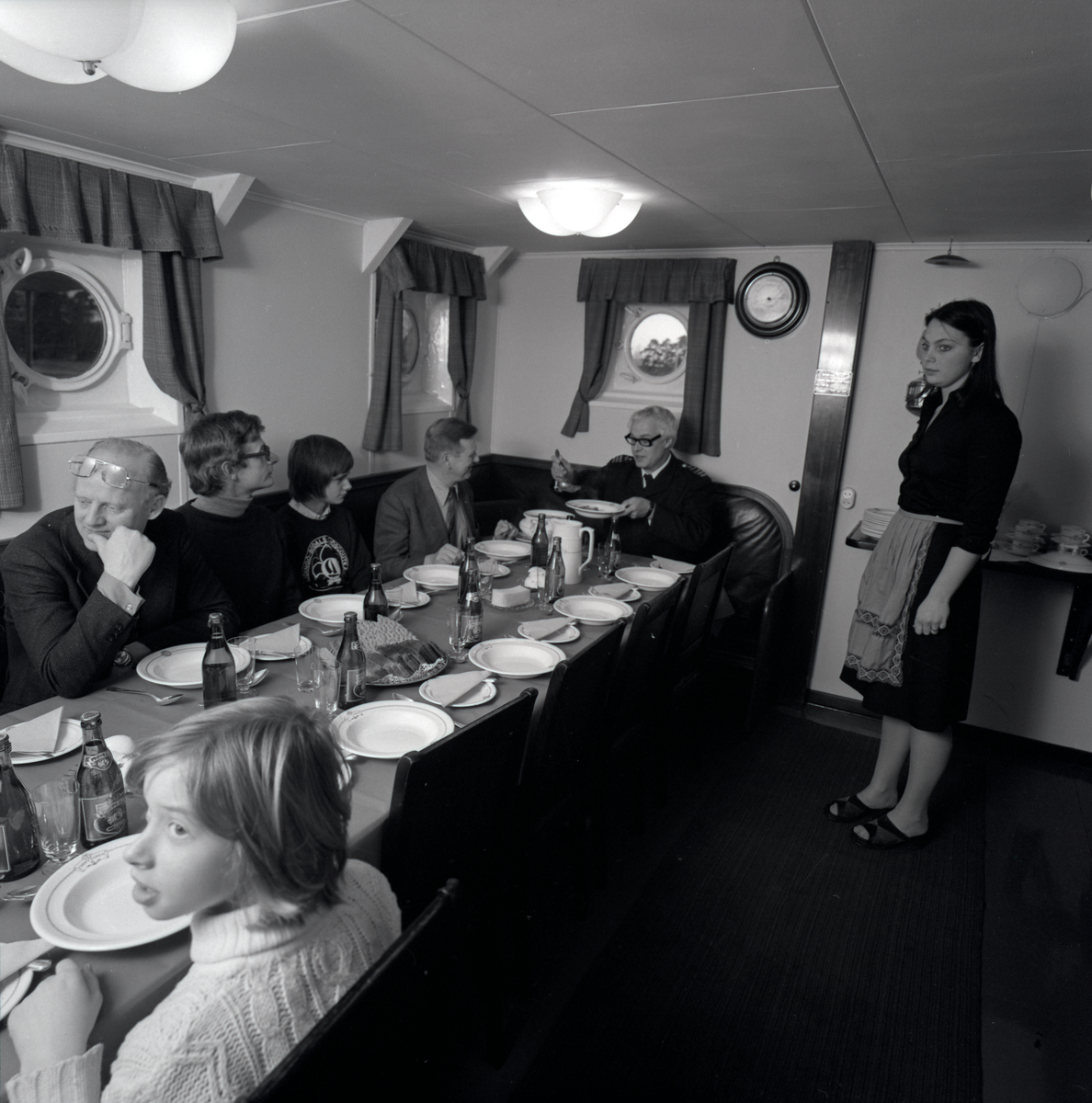 Isbrytaren SANKT ERIK. Salongen. Närmast kameran överstyrman R Kjellström. Stående salongsuppassare Y Johansson. Runt bortdet från höger kapten Einar Arkrot, Berrnt Friberg (Sveriges Radio), hans son, Klas Helmerson (SSHM), informationschef Jan-Olof Stahlsbo (Stockholms hamn).