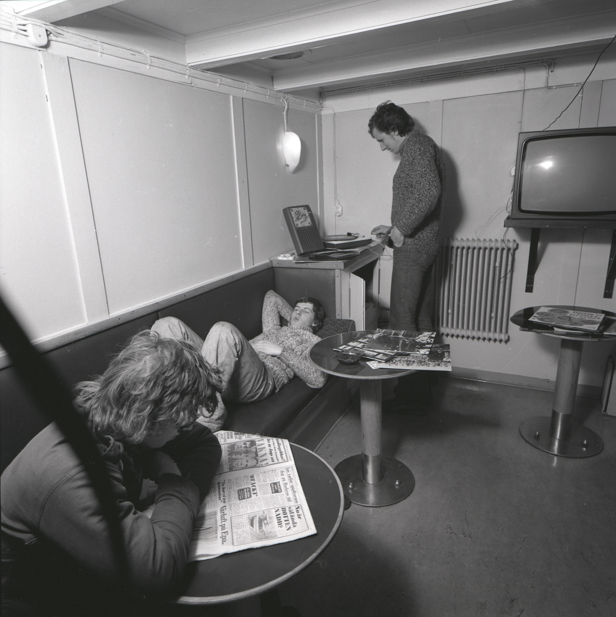 Isbrytaren SANKT ERIK. Manskapets dagrum. Matros Gunnar Reifenberg, smörjae Lennart Pettersson och matros Bengt Sundberg.