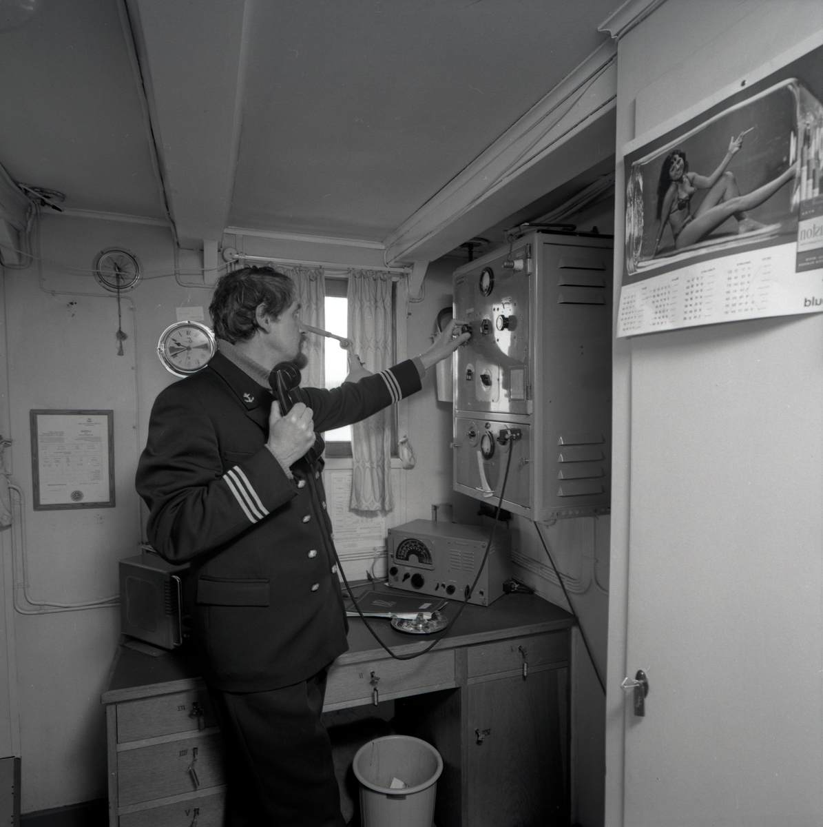 Isbrytaren SANKT ERIK. Överstyrman R Kjellström vid radiotelefonen i radiohytten.