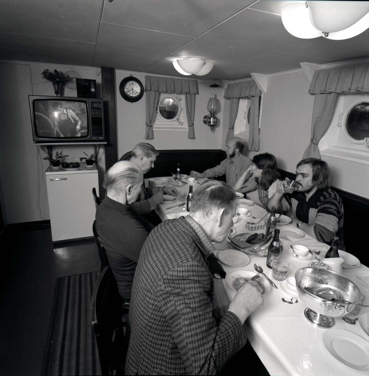 Isbrytaren SANKT ERIK. Befälsmässen. 3 Makinist L Blomström. 4 Maskinist F Edström, maskinistchef K E Andersson, överstyrman C G Sundius, salongsuppassare Y Johansson. 2 Styrman J Carlsson.