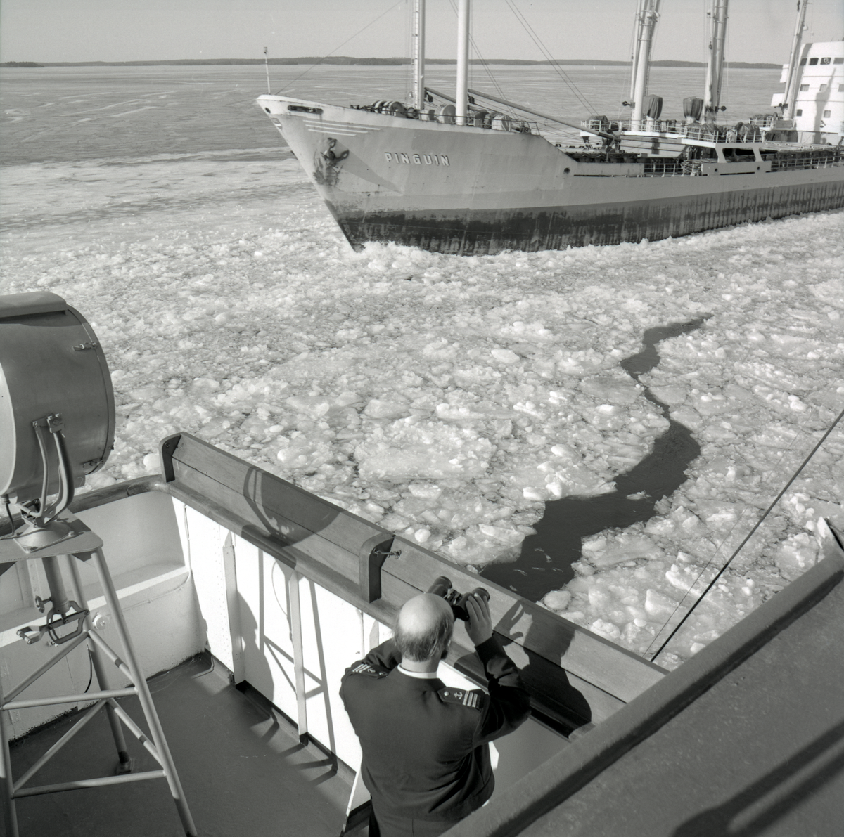 Isbrytaren SANKT ERIK möter tyska M/s PINGUIN på Mälaren. På bryggan överstyrman C G Sundius.
