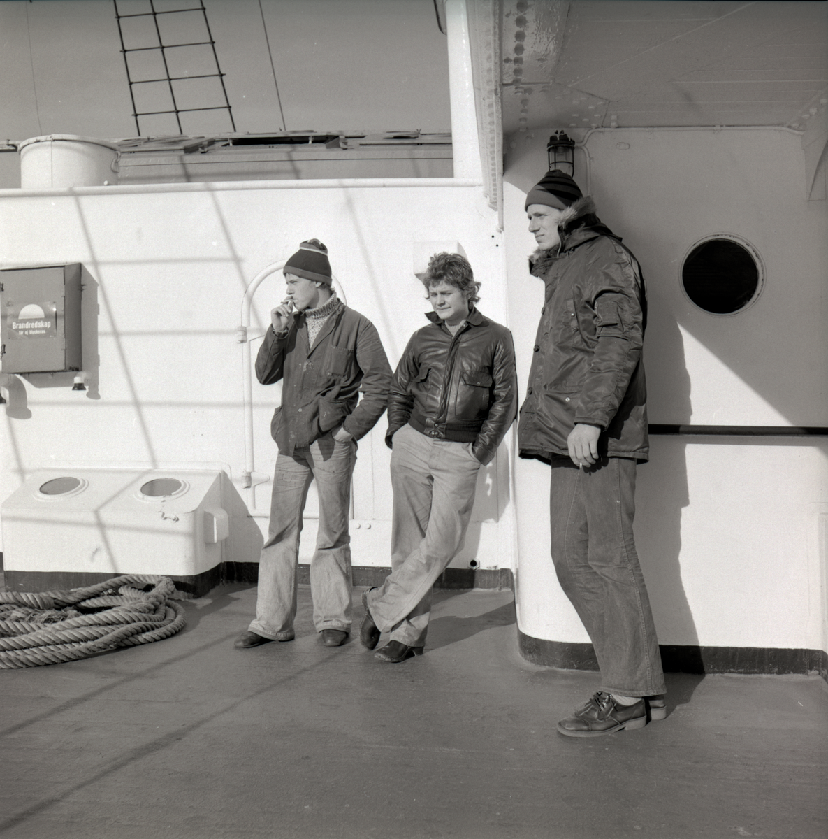 Isbrytaren SANKT ERIK. Matros Curt Rosell, kocken M P Pihlqvist och matros B Sundberg på däck.