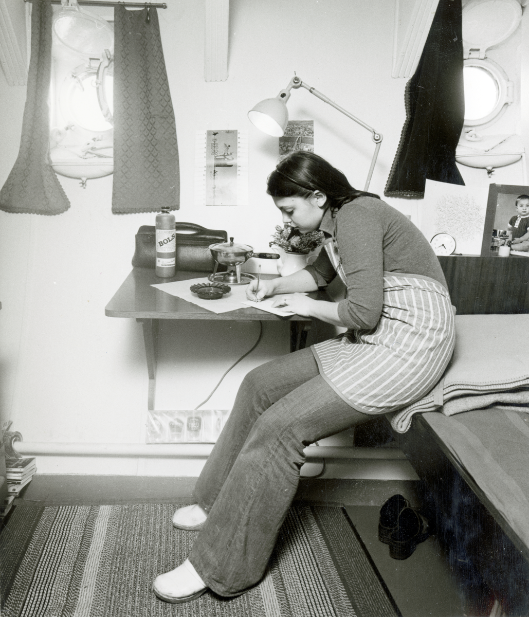 Isbrytaren SANKT ERIK. Salongsuppassare Yvonne Johansson i sin hytt.