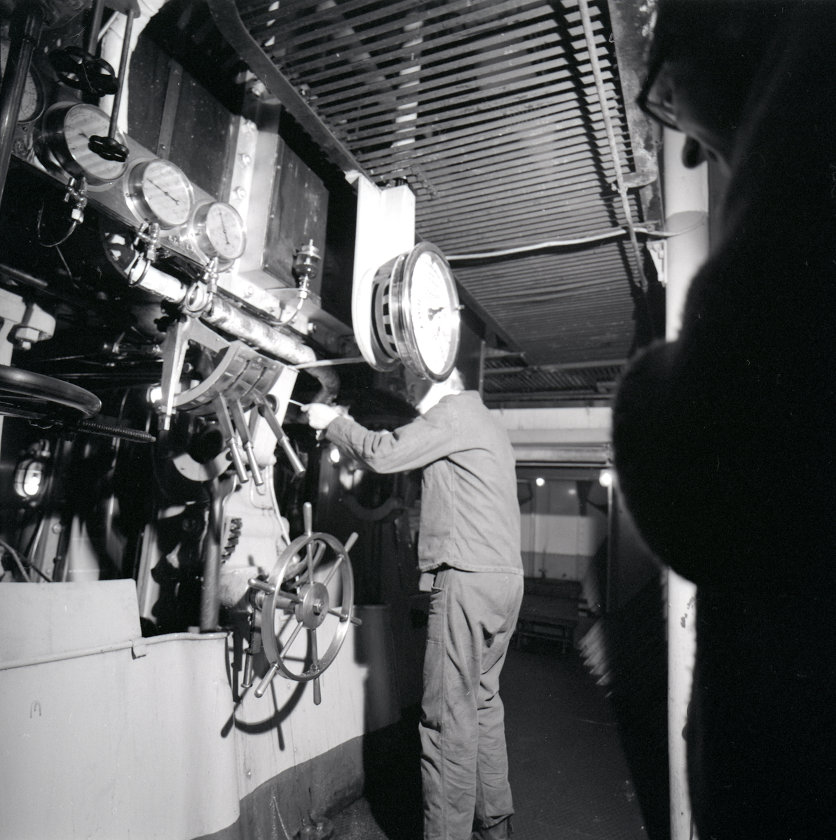 Isbrytaren SANKT ERIK. 4.e maskinist Frans Edström (eller 2:e maskinist Karl Larsson) vid maskintelegrafen i förliga maskin.