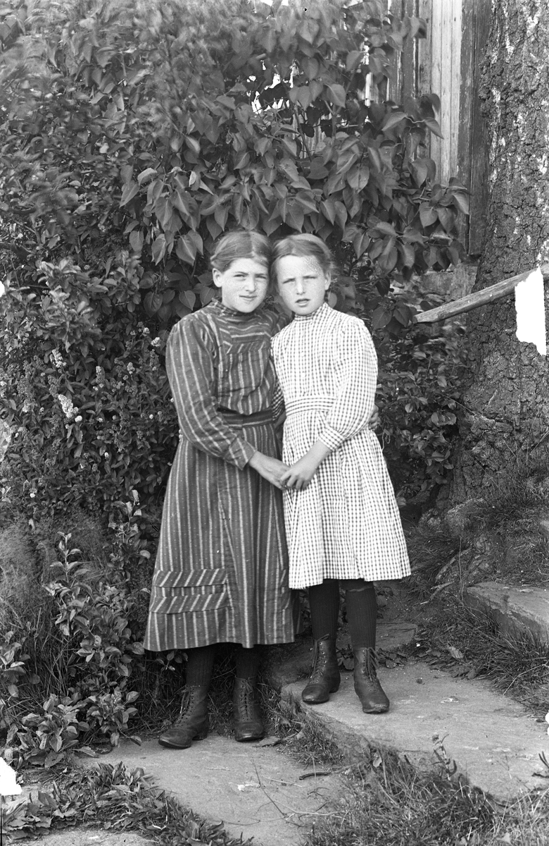Beställare är vaktmästaren i Tivedstugan på nya Påskberget, så troligen är de två flickorna hans döttrar. De står i en flack trappa vid ett syrenbuskage vid en byggnad. Fotografen har noterat "Weddige" till bilden, så det är oklart om bilden är tagen vid Tivedstugan.