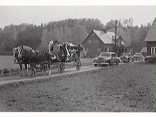 Begravningsprocession med likvagn dragen av två hästar och efterföljande bilar.