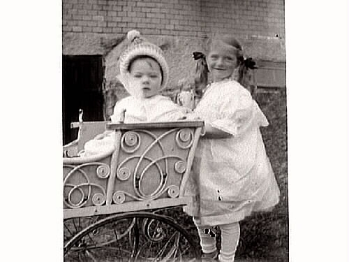 Syskonbild. Barnporträtt. Troligen handlanden Olof Larsson och hustrun Anna Larssons barn, Carin Dagmar Larsson och Erik Sören Larsson i Tvååker. Olof och Anna hade 10 barn och bodde först i "Hotellet", där Olof arrenderade gästgiverirörelsen och även drev en lanthandel. När han uppfört sitt eget hus på andra sidan vägen flyttade han 1909 även affären dit. Från 1912 bedrev Konsum verksamhet i butikslokalen.