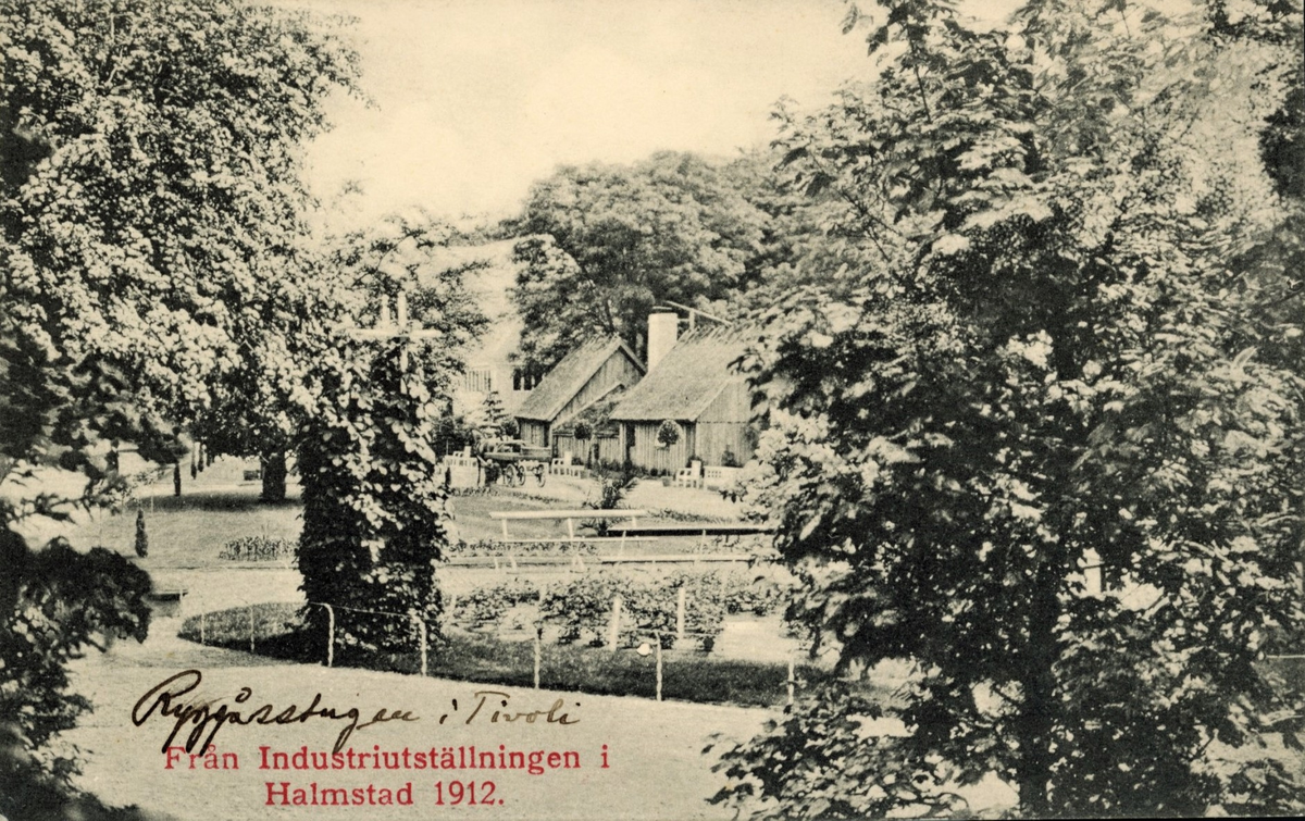 Vykort, "Från Industriutställningen i Halmstad 1912", anteckning: "Ryggåsstugan i Tivoli". Vy över Tivoliparken mot ryggåsstugan med en större utställningsbyggnad i bakgrunden.