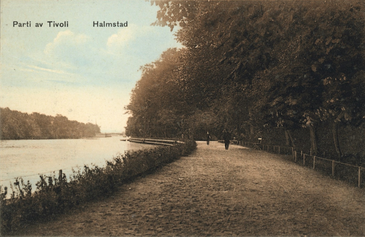Kolorerat vykort, "Parti av Tivoli Halmstad". Vy över bred grusgång längs Nissan. Ett par flanörer går på vägen under stora trädkronor.