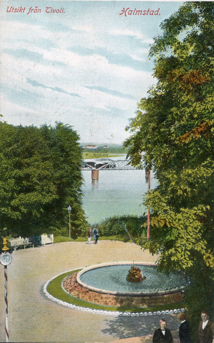 Kolorerat vykort, "Utsikt från Tivoli. Halmstad.", avsänt 17 juni 1908. Vy från en höjd ovanför en damm med utsikt över Nissan, där ett tåg passerar på järnvägsbron. I nedre högra hörnet står tre pojkar.