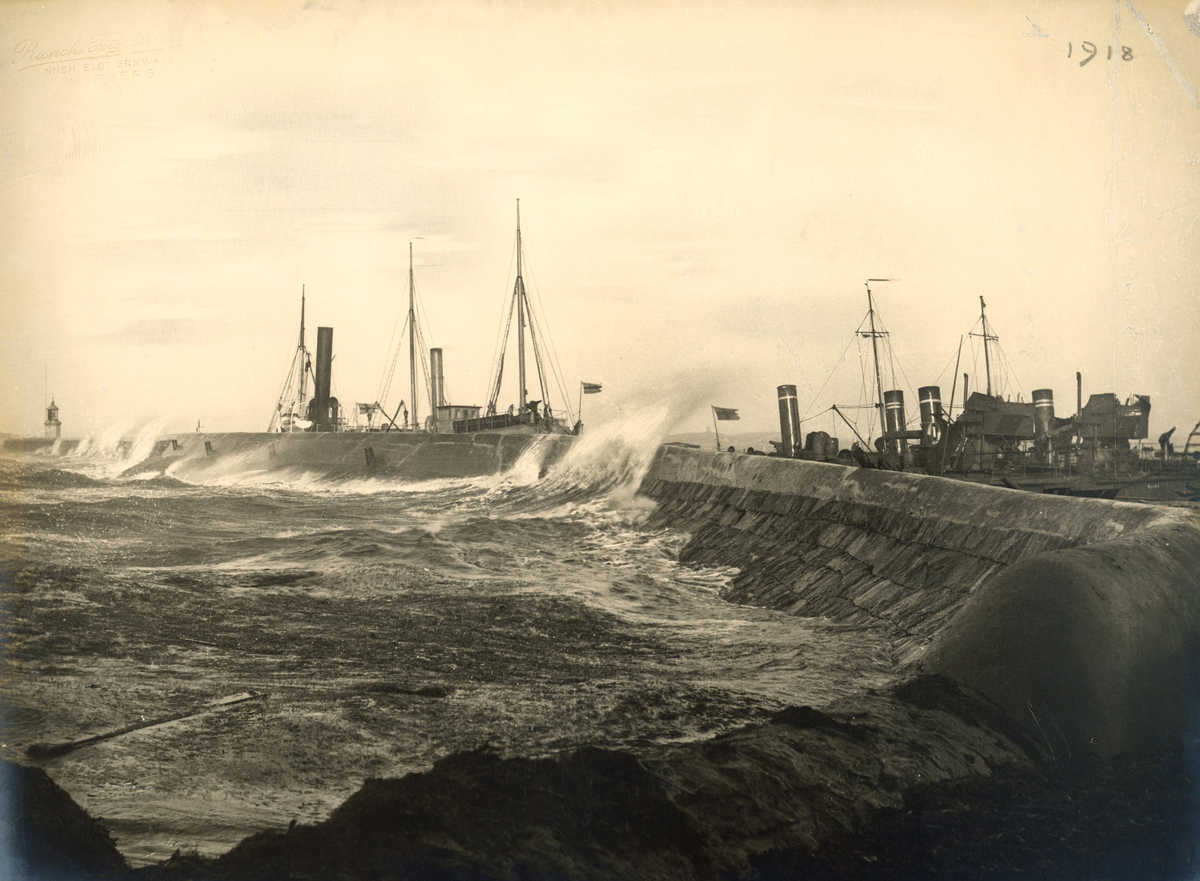 Stormvågor mot piren i Varbergs hamn med master och skorstenar synliga på båtar som sökt lä bakom vågbrytaren.