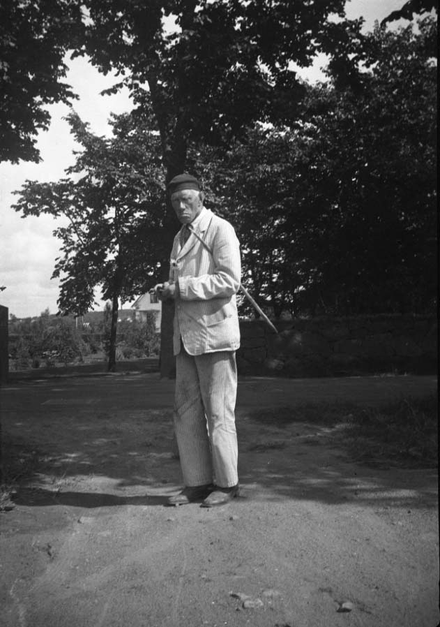 Porträtt av en man med ljus kostym och mössa. Under armen sitter en käpp. En notering till bilden anger namnet Kasper K...sén, kanske Kelnsén. Bilden är tagen utomhus och bakom de stora lövträden längs en stenmur skymtar ett hus med trädgård. Meddela oss gärna om du har mer information om mannen och miljön!