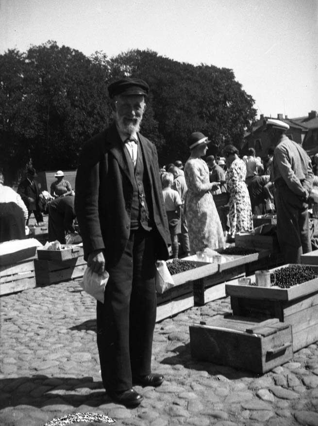 En man står med påsar i händerna på torghandel i Varberg. Bredvid honom står lådor med körsbär. Huset till höger är det gamla Apoteket. Av damernas klädsel att döma ser det ut att vara 1930-tal.
