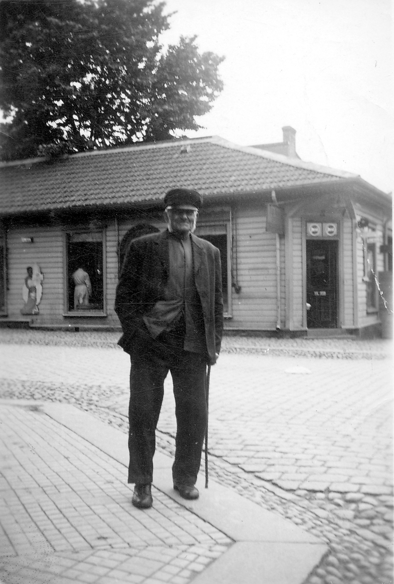 Gatuvy från Varberg där en man står i en gatukorsning. Trottoar och gata har olika typer av stenläggning. I bakgrunden ligger en affär med reklamskyltar för Persil ovanför ingången på hörnet och för bananer på fasaden till vänster. Mannen förmodas vara "Klippare Nilsson" och enligt uppgift står han i hörnet av Östra Långgatan-Borgmästaregatan med butiken på tomten Färgaren 4 bakom sig.