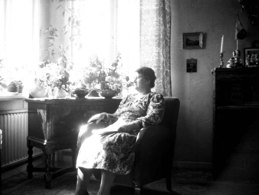 Porträtt av en oidentifierad kvinna, som sitter i en fåtölj vid ett fönster. På skänken intill står flera blombuketter så möjligen firas hennes födelsedag. Kanske avser noteringen Berta eller Beda i Eftra denna bild.