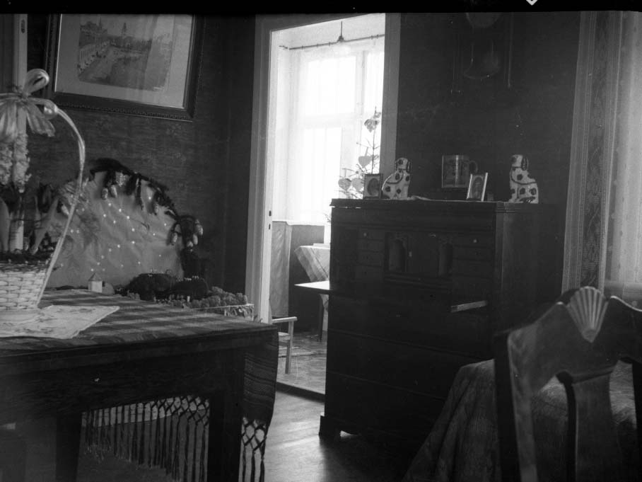 Interiör från ett vardagsrum mot glasveranda dä en julgran står klädd. I förgrunden en korg med hyacinter och vid väggen någon sorts juldekoration med kottar. Troligen samma bostad som bildnr E8220-E8221.