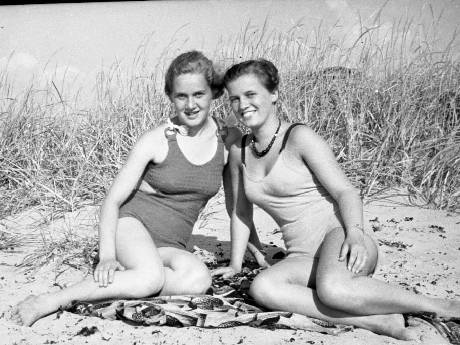 Två unga kvinnor (ej identifierade) solbadar på en strand, sannolikt Apelviken. Noterat på negativfack "Birgit .... syster". Eric hade åtta syskon, så möjligen är det hans systrar.