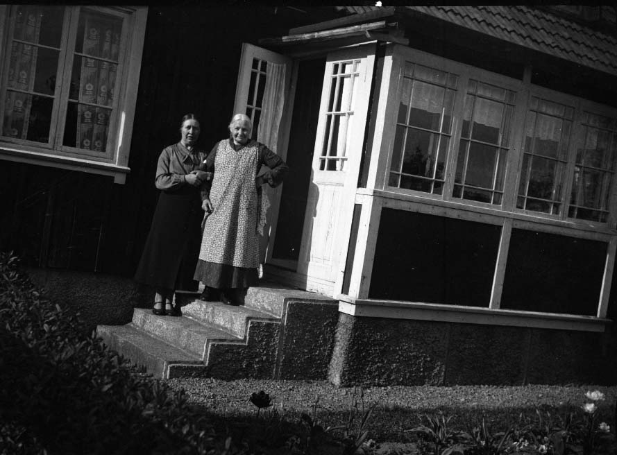 Två kvinnor står på trappan utanför ett hus med glasveranda. Kanske avser anteckningen "Mamma, Hanna" i negativblocket denna bild? Verandan stämmer även med bilderna E8219 och E8221.